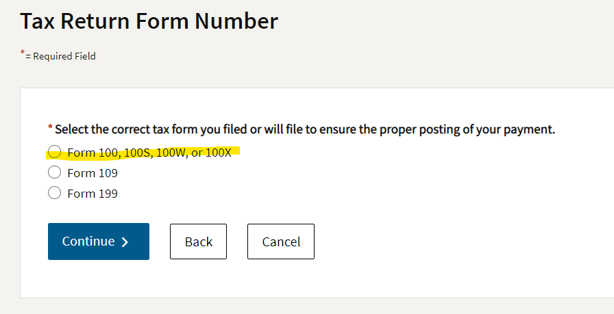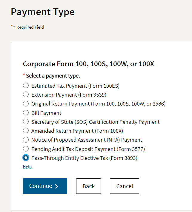 6Select “Pass-Through Entity Elective Tax (Form 3893)” at the bottom.Important: Selecting the right tax form let's the FTB know where to apply your funds. Make sure you've chosen the Pass-Through Entity Elective Tax (Form 3893).