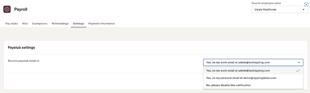 3Employee SettingsIf a worker has more than one email address saved in Rippling (work and personal, in most cases), they can choose the email address to which they receive these emails. They can also choose to disable email notifications if they prefer. Employees can update their payroll settings by navigating to their Rippling profile > My Pay section > Settings > click Edit and update the options.