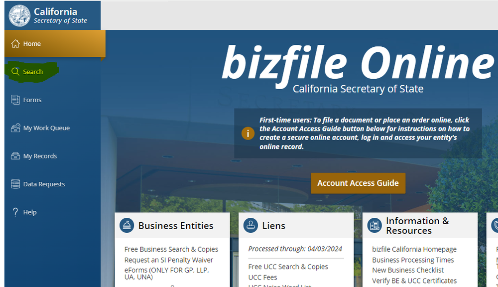 - While already logged in to your account, on the left-hand side click on the search bar and enter your entity name