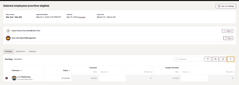 - If your pay runs don't already contain the Bonus pay column, click the "+" sign to the right of a pay run.