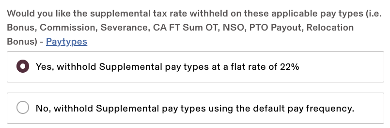 Select that you want to withhold supplemental pay types at a flat rate of 22%: