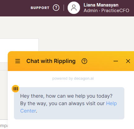 10When to Contact Rippling vs PracticeCFO?When you first start out, contact PCFO at payroll@practicecfo.com until you get through your first 2 payroll runs.Payroll Processing: Contact PracticeCFO for help processing your payroll, payroll tax questions, and adding on any new products.General Rippling Functions: Contact Rippling support by using Live Chat. Use this feature by accessing support from your Rippling organization. Click on "Support" and the chat with Rippling will pop up.